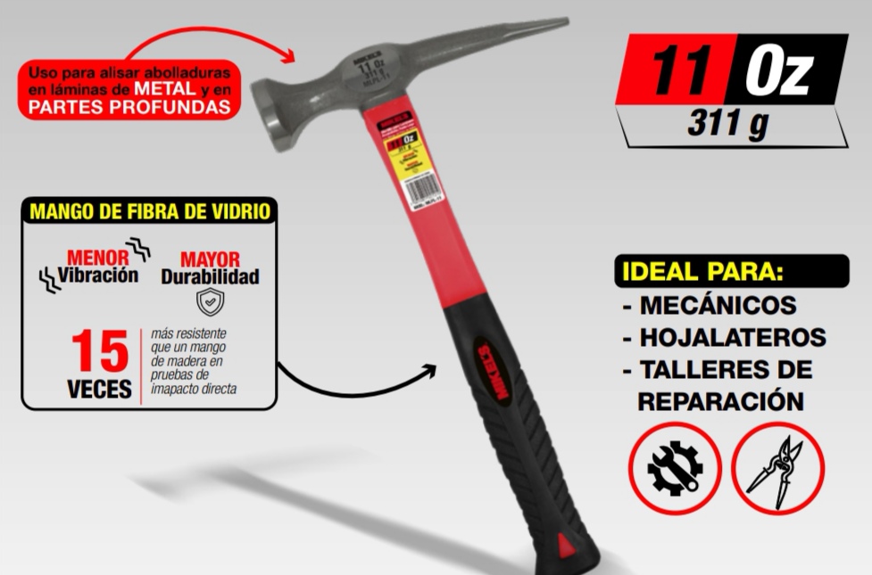 DESCRIPCIÓN: Martillo para laminero,desabollador punta larga con mango de fibra de vidrio